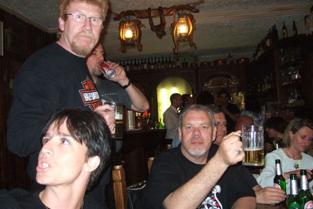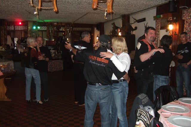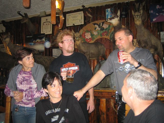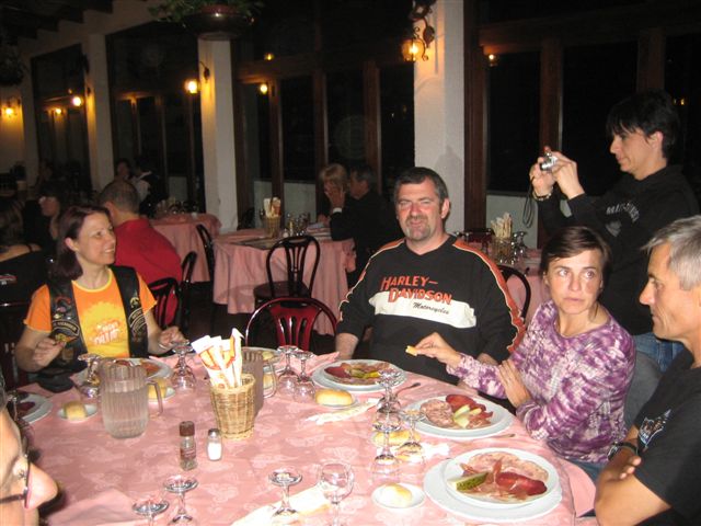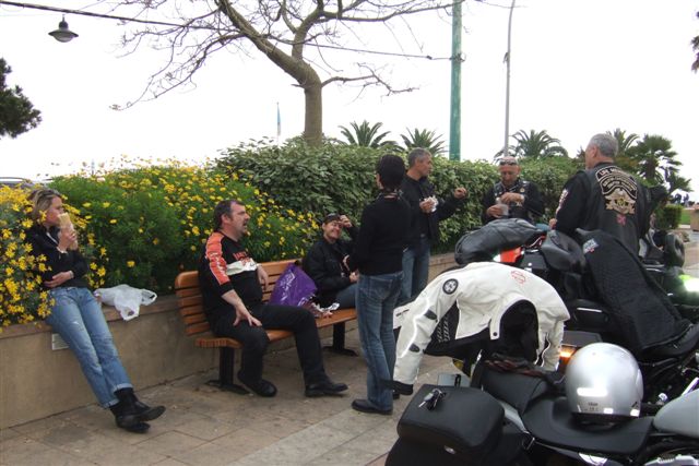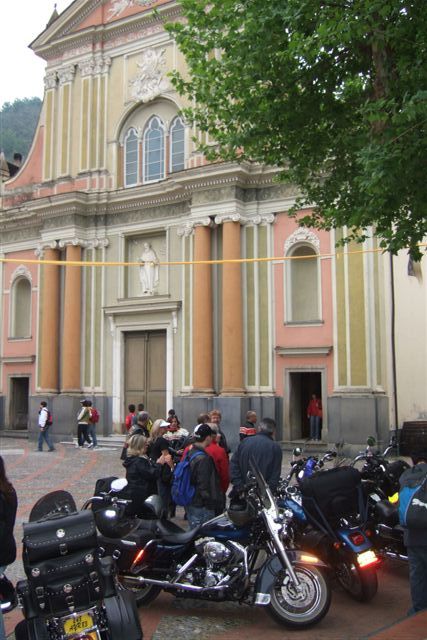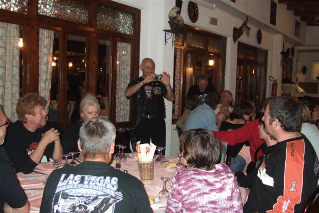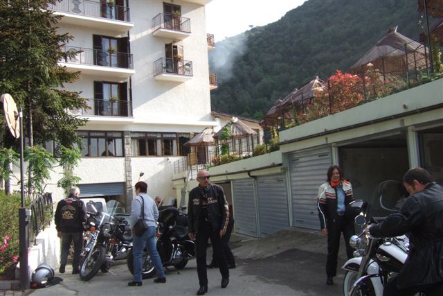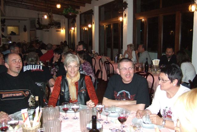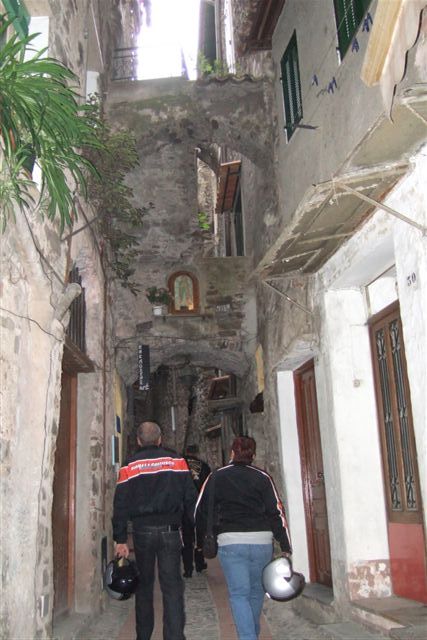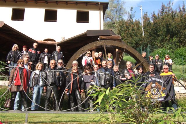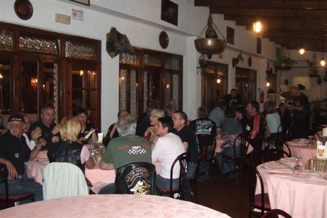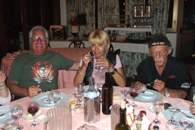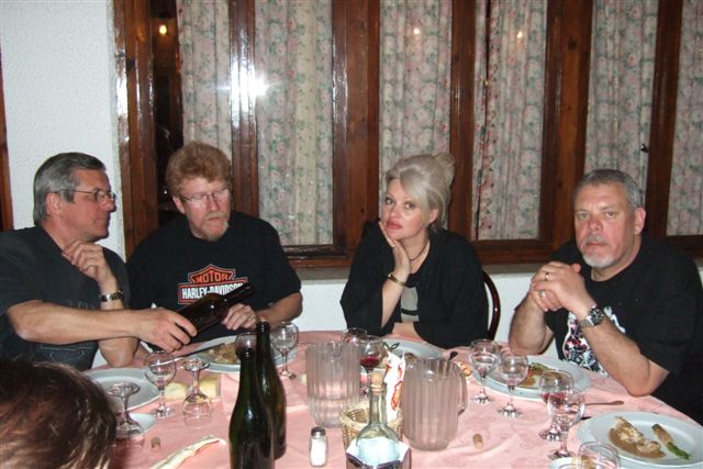 Ce sont 30 membres de notre Chapter et 20 motos, qui ont pris la route pour se rendre à Rocchetta Nervina en Italie. Le kilométrage à faire dans la journée, n'étant pas excessif, nous avons pu flâner quelque peu et emprunter un itinéraire champêtre, qui par les Gorges du Blavet, nous a mené à Bagnols-en-Forêt où avons fait une pause café. Puis après un ravitaillement en essence à Mandelieu, il nous a fallu prendre l'autoroute jusqu'à Menton où nous avons pique-niqué sur la promenade du bord de mer. Après ce casse-croûte et la traversée de Vintimille, nous avons pris, par la route des Oliviers, la direction de la très pittoresque petite ville de Dolceacqua, où quelques courageux bipèdes sont montés jusqu'au château qui domine la ville et la vallée, tandis que d'autres se sont "sacrifiés" autour de quelques "tartines de houblon" dans l'unique et très louable but, de surveiller les motos. Encore quelques kilomètres et nous voici arrivés à notre hôtel. La pluie ayant eu la bienveillante délicatesse d'attendre notre installation avant d'arroser copieusement la vallée, c'est avec les motos bien au sec dans des boxes, que nous avons pu débuter cette soirée autour d'un verre, avant de passer à table où un repas "Rebelaisien" et délicieux nous attendait et c'est à une heure avancée de la nuit que Morphée nous a accueilli dans ses bras, après que nous ayons dansé sur les rythmes variés d'un orchestre mono-musicien mais néanmoins très présent (N'est-il pas Doc. ?) UNE SUPER BALADE ET UNE SUPER SOIREE !!!