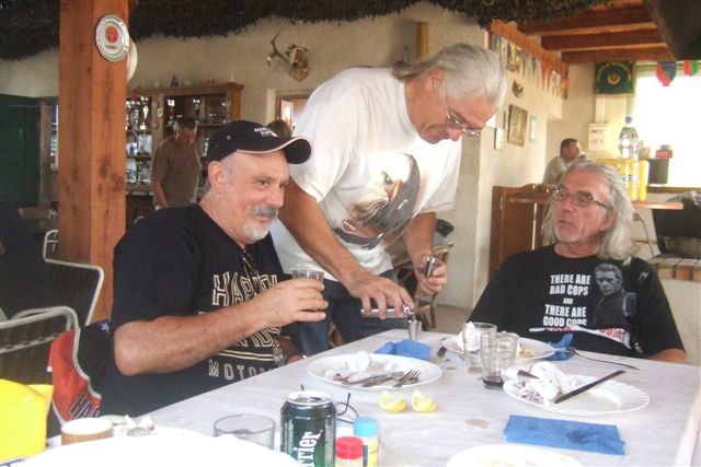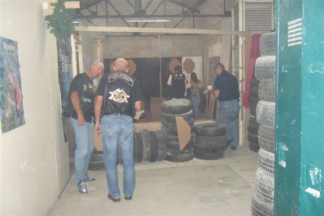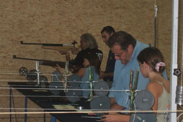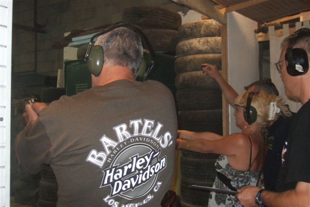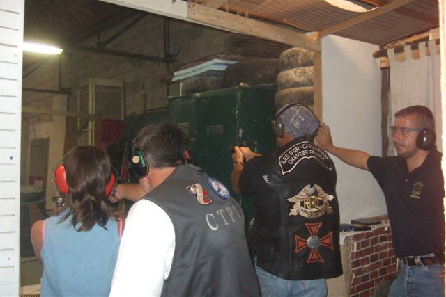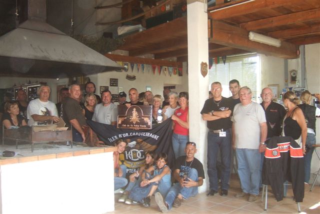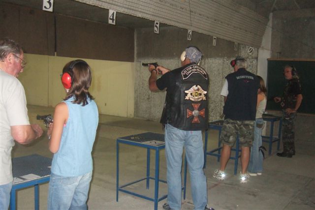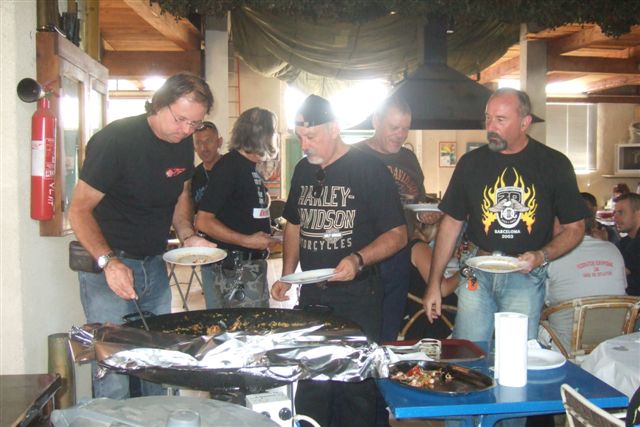 BALADE, TIR & PAELLA Dimanche 26 Août 2007 §§§ La balade de ce dernier dimanche du mois d'août ne fut pas très longue (Une petite centaine de km), car le timing de cette journée à thème, a du tenir compte des impératifs du CTPV (Club de Tir Police Varois) qui nous a accueilli, très chaleureusement, dans ses locaux de la Seyne sur Mer. Mais, je crois pouvoir affirmer, au vu de la satisfaction générale, qu'aucun des participants n'a regretté son déficit de kilomètres. L'initiation au tir à été organisée, de façon très ludique sous la forme d'un mini concours. Nos vaillantes motardes et nos vaillants motards ont donc pu mesurer leur adresse, tour à tour au pistolet et à la carabine à air comprimé, puis au revolver en calibre 38 "spécial"et pour finir au pistolet automatique en calibre 9 mm "Parabellum". Vous pourrez reconnaître les heureux gagnants en regardant le reportage photo. Après le traditionnel apéro, place au troisième volet de cette journée, une excellente paëlla préparée sur place et dont les merveilleuses odeurs de cuisson ont parfumé le stand de tir et excité nos papilles durant les séances de tir. Un grand merci à l'équipe du CTPV qui a fait de cette journée découverte, une expérience très réussie pour tous.