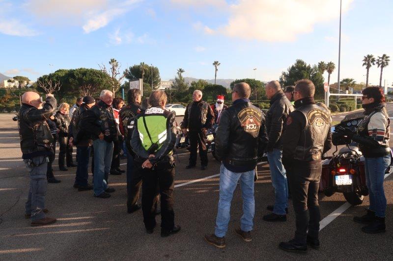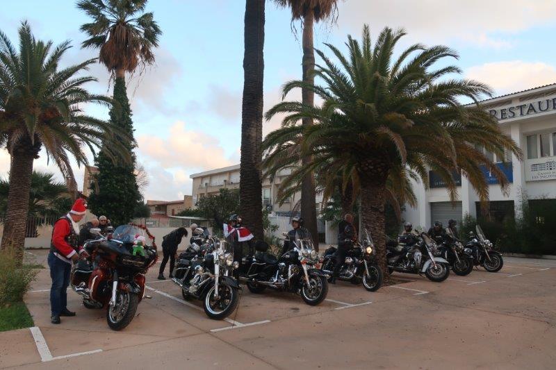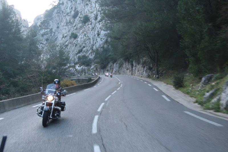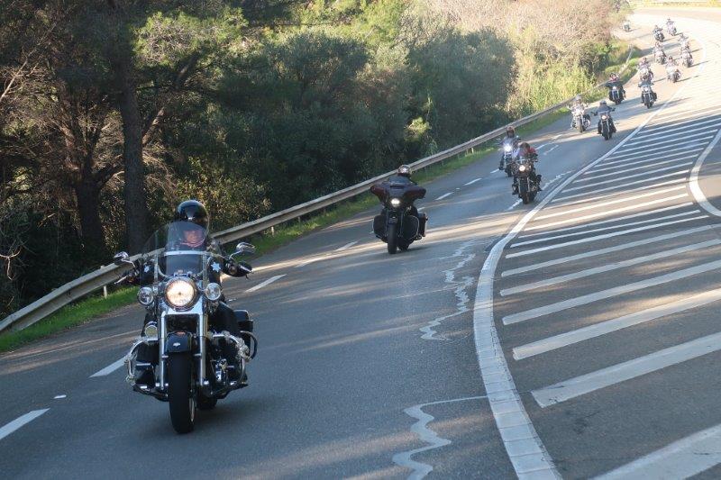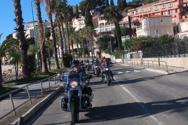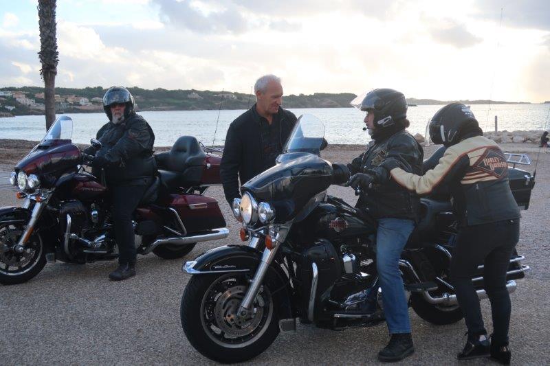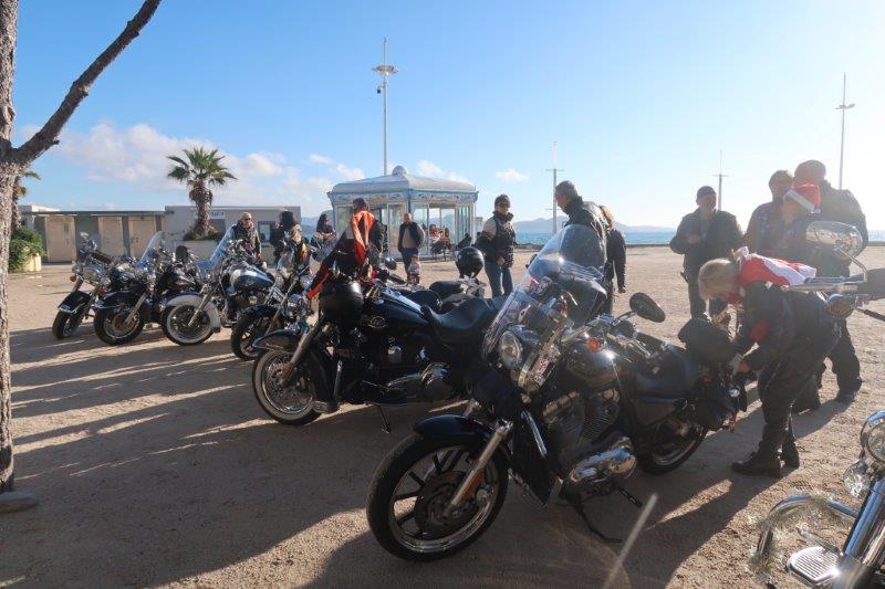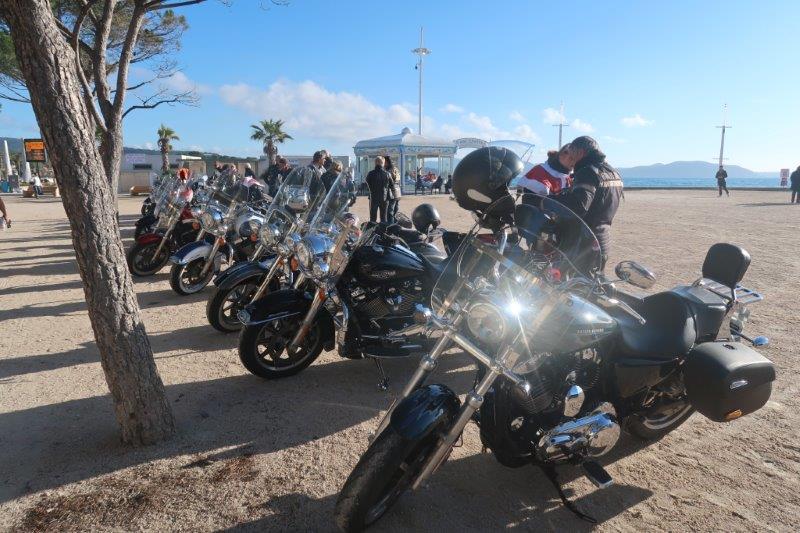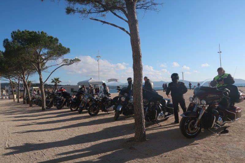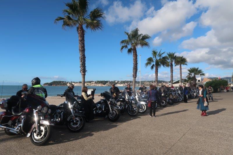 Notre trentaine d'Harley-Davidson, alignées comme à la parade, avec notre belle mer méditérranée en toile de fond,