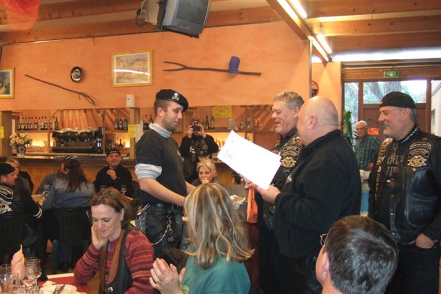 Dimanche 20 novembre 2005 RALLYE ANNUEL du Chapter Cette année notre Rallye annuel a été dédié au Téléthon, les bénéfices de la journée ont permis de faire un don de 450 €. Ce sont 61 participants, répartis sur une quarantaine de motos, qui ont suivi le road book, qui les a mené de notre concession au restaurant de l'Hippodrome d'Hyères, en passant par plusieurs contrôles où à chaque fois un questionnaire les y attendait. Le rallye s'est terminé à l'arrivée par un parcours de lenteur. C'est l'occasion de remercier Jean Claude notre "Activities Officer" et tous ceux qui ont participé à l'organisation et à la réussite de cette manifestation. Un grand Merci également à notre concession Harley-Davidson Carqueiranne qui a fourni une grande partie des lots de la Tombola.