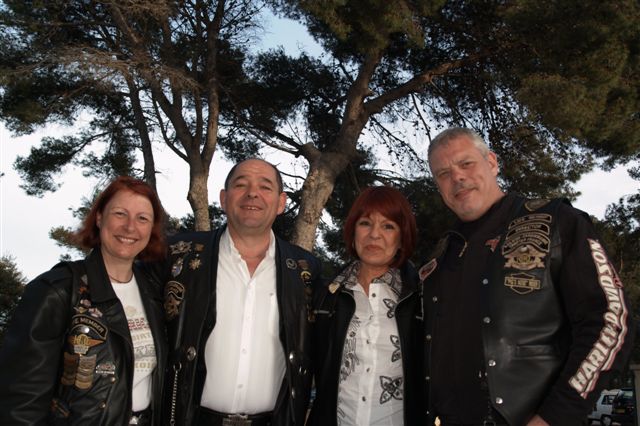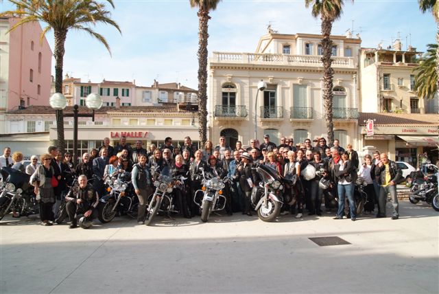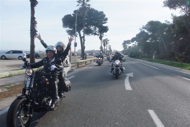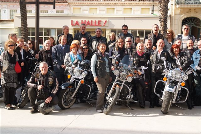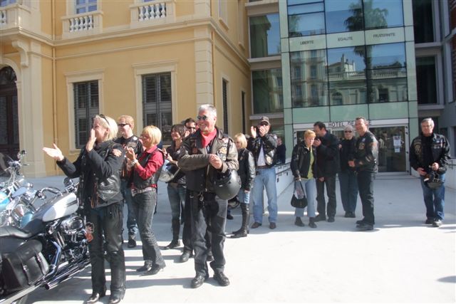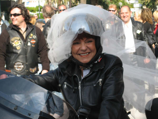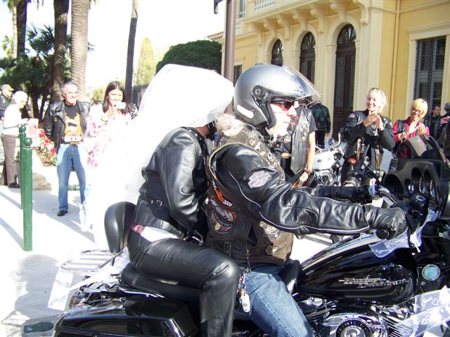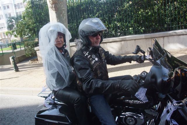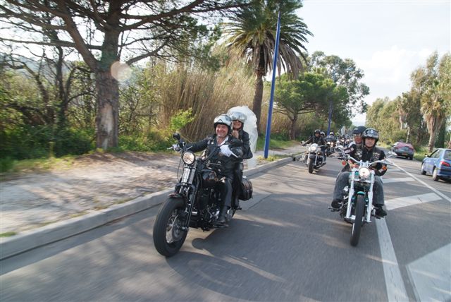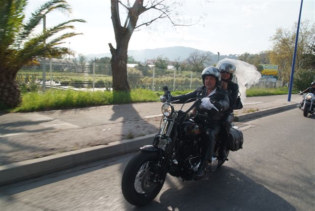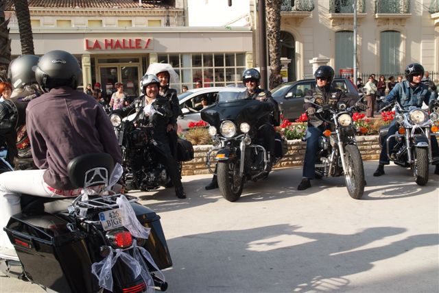 de Harley-Davidson a escorté les jeunes mariés du domicile des promis à la Mairie d'Hyères les Palmiers, puis le joyeux et tonitruant cortège s'est dirigé au travers des rues animées de la cité, vers le Port et les plages, pour arriver aux "Pins Maritimes" où un buffet d'honneur l'attendait.