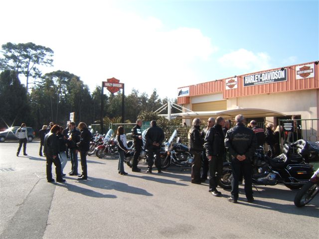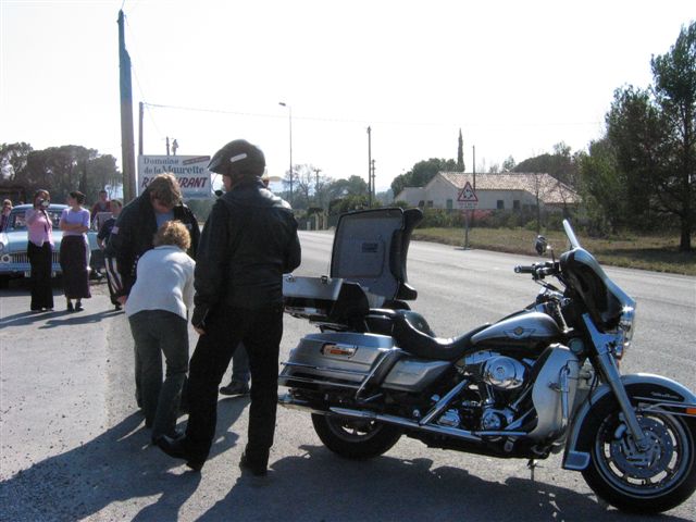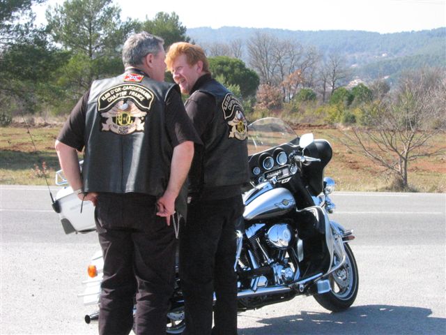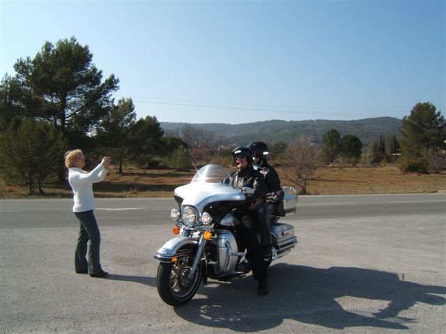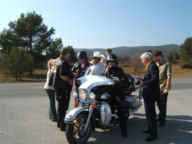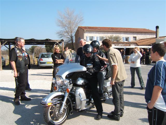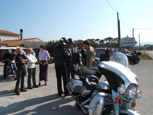 C'est par une belle journée printanière (le Printemps arrivait d'ailleurs ce jour-là) que les 50 Personnes et les 31 Motos ont pris la direction de Ramatuelle par la côte où nous attendait un copieux petit-déjeuner offert par Sandrine et Ian. Un grand merci à Sandrine et Ian pour leur sympathique invitation. Nous reprenons notre la balade par Sainte-Maxime et le Muy pour arriver à la Motte au Resto « Le Domaine de la Maurette » où le patron est un motard. Moments conviviaux autour d'un délicieux et copieux repas aux herbes de Provence (l'agneau sauce basilic). Moments d'émotion, quand Ophélie, qui fêtait ses 20 ans, dans ce même restaurant, a réalisé son rêve, « faire un tour en Harley », ce qui fut fait sur l'Electra de Christian. Bravo et Merci à Christian. Un pin's de notre Chapter a été offert à Ophélie et un agrandissement la représentant parmi nous lors de la photo de groupe traditionnelle autour du drapeau, lui sera envoyé. Après tous ces bons moments, il a fallu songer au retour. Celui-ci fut fait par la Nationale 7 et c'est à Carnoules que nous nous sommes dit au revoir. Cette journée est passée bien trop vite mais elle a été bien remplie et avec ce temps radieux tout le monde était enchanté.