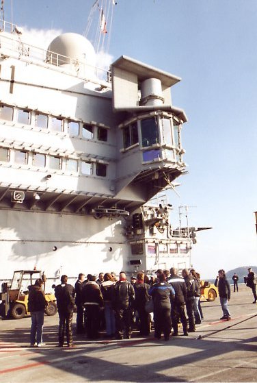 Enfin, ce que tout le monde attendait avec impatience : la visite du Bâtiment. Nous avons pu voir, le Hangar malheureusement vide (on aurait bien voulu voir quelques avions !) le Pont d'Envol, la Passerelle et la Passerelle Aviation. Nous avions comme guide le très symphatique Major Jean-Luc Vuiallat qui a répondu à nos très nombreuses questions.