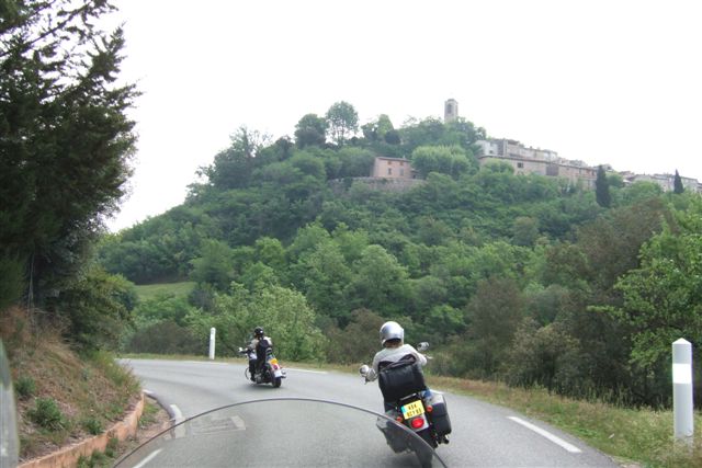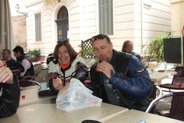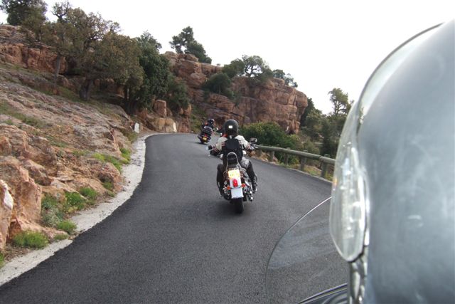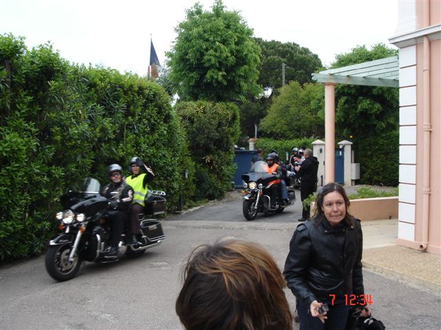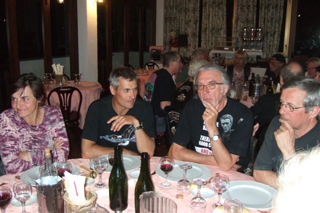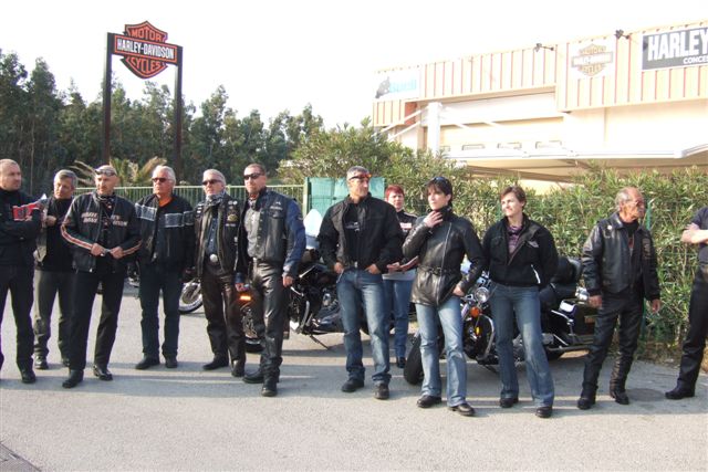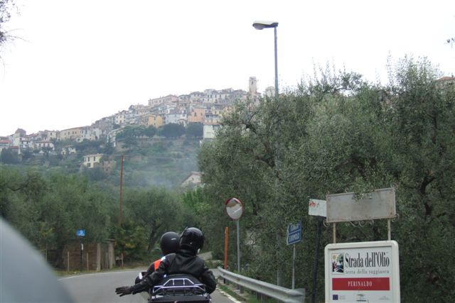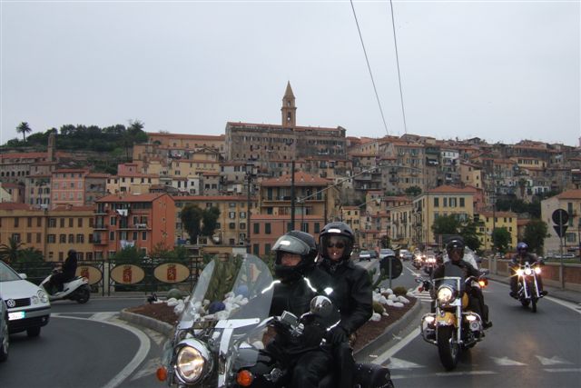 Ce sont 30 membres de notre Chapter et 20 motos, qui ont pris la route pour se rendre à Rocchetta Nervina en Italie. Le kilométrage à faire dans la journée, n'étant pas excessif, nous avons pu flâner quelque peu et emprunter un itinéraire champêtre, qui par les Gorges du Blavet, nous a mené à Bagnols-en-Forêt où avons fait une pause café. Puis après un ravitaillement en essence à Mandelieu, il nous a fallu prendre l'autoroute jusqu'à Menton où nous avons pique-niqué sur la promenade du bord de mer. Après ce casse-croûte et la traversée de Vintimille, nous avons pris, par la route des Oliviers, la direction de la très pittoresque petite ville de Dolceacqua, où quelques courageux bipèdes sont montés jusqu'au château qui domine la ville et la vallée, tandis que d'autres se sont "sacrifiés" autour de quelques "tartines de houblon" dans l'unique et très louable but, de surveiller les motos. Encore quelques kilomètres et nous voici arrivés à notre hôtel. La pluie ayant eu la bienveillante délicatesse d'attendre notre installation avant d'arroser copieusement la vallée, c'est avec les motos bien au sec dans des boxes, que nous avons pu débuter cette soirée autour d'un verre, avant de passer à table où un repas "Rebelaisien" et délicieux nous attendait et c'est à une heure avancée de la nuit que Morphée nous a accueilli dans ses bras, après que nous ayons dansé sur les rythmes variés d'un orchestre mono-musicien mais néanmoins très présent (N'est-il pas Doc. ?) UNE SUPER BALADE ET UNE SUPER SOIREE !!!
