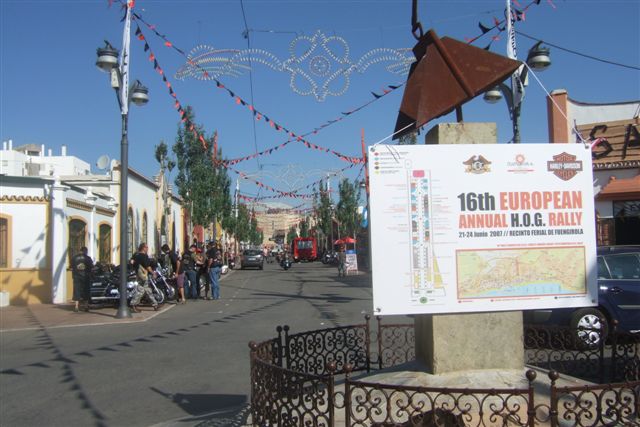 16ème European HOG Rally FUENGIROLA §§§ Voyage et Rallye du 18 au 26 Juin 2007. §§§ C'est une trentaine de membres du Chapter qui a fait le voyage, sur les routes magnifiques du centre de l'Espagne, jusqu'en Andalousie, à Fuengirola, une belle station balnéaire comme on en trouve sur la côte Espagnole. Sa particularité est le Recinto Ferial et ses Casetas ! Construites par diverses associations, les casetas sont des salles de fêtes chacune construite dans un style propre et bordant une avenue dédiée à la fiesta ! C'est donc ce lieu quelque peu magique que le HOG a choisi pour y organiser son 16ème rallye Européen. Bon choix, car la fête y fut des plus réussie, tout y était, ambiance, météo, spectacles, belles balades dans des lieux comme Séville, Malaga, Gibraltar, Ronda, Sierra Nevada ... et une grosse participation, puisque l'on parle de 8 à 10.000 entrées. § La Route Aller !!!