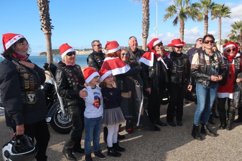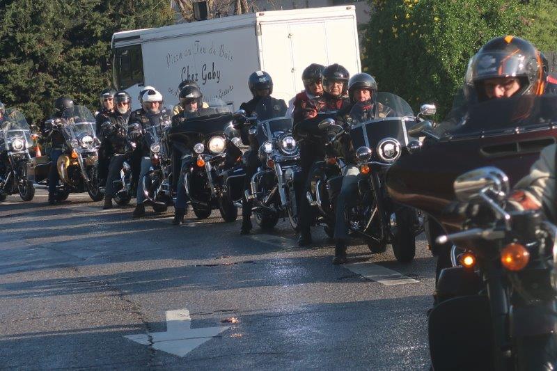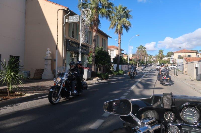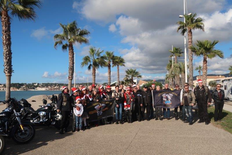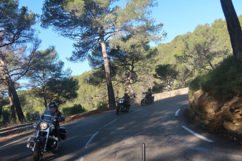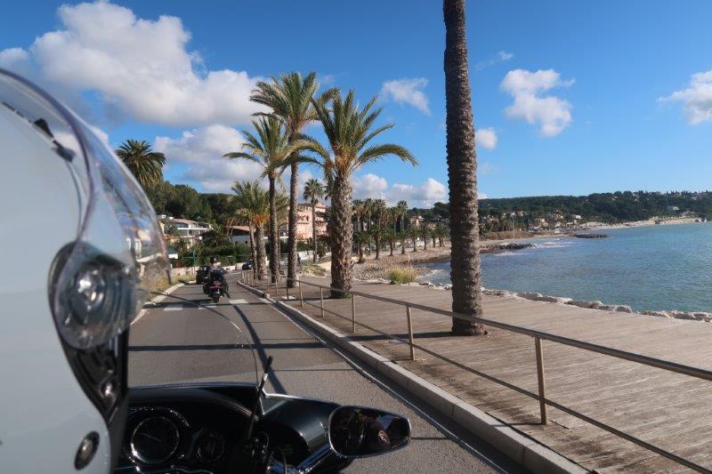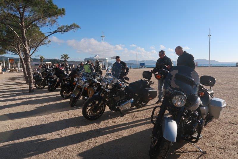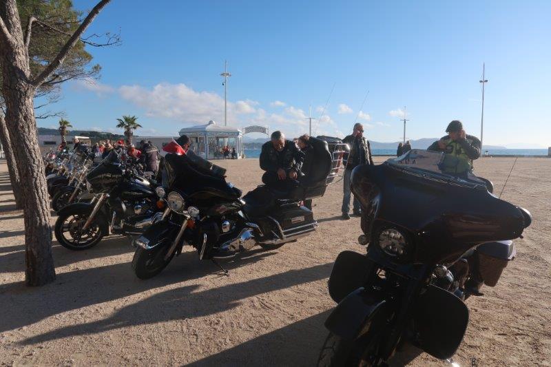 Notre trentaine d'Harley-Davidson, alignées comme à la parade, avec notre belle mer méditérranée en toile de fond,