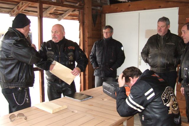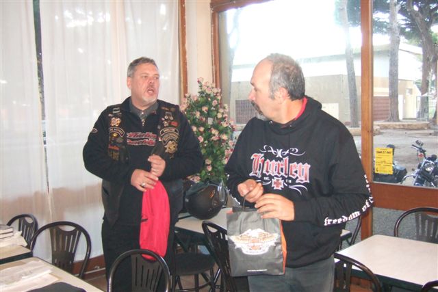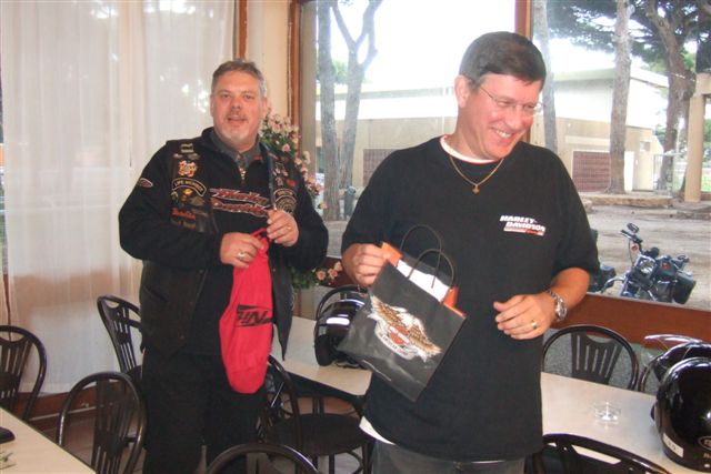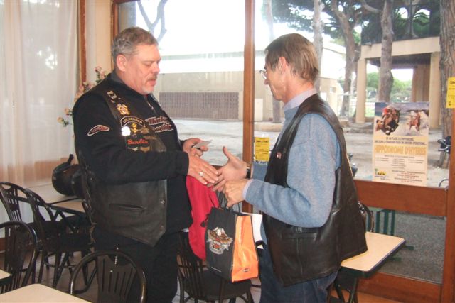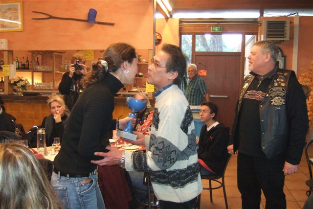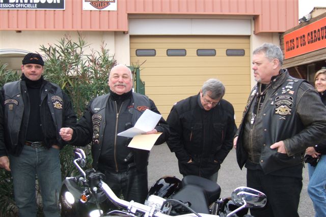 Dimanche 20 novembre 2005 RALLYE ANNUEL du Chapter Cette année notre Rallye annuel a été dédié au Téléthon, les bénéfices de la journée ont permis de faire un don de 450 €. Ce sont 61 participants, répartis sur une quarantaine de motos, qui ont suivi le road book, qui les a mené de notre concession au restaurant de l'Hippodrome d'Hyères, en passant par plusieurs contrôles où à chaque fois un questionnaire les y attendait. Le rallye s'est terminé à l'arrivée par un parcours de lenteur. C'est l'occasion de remercier Jean Claude notre "Activities Officer" et tous ceux qui ont participé à l'organisation et à la réussite de cette manifestation. Un grand Merci également à notre concession Harley-Davidson Carqueiranne qui a fourni une grande partie des lots de la Tombola.