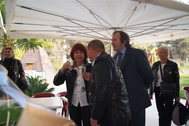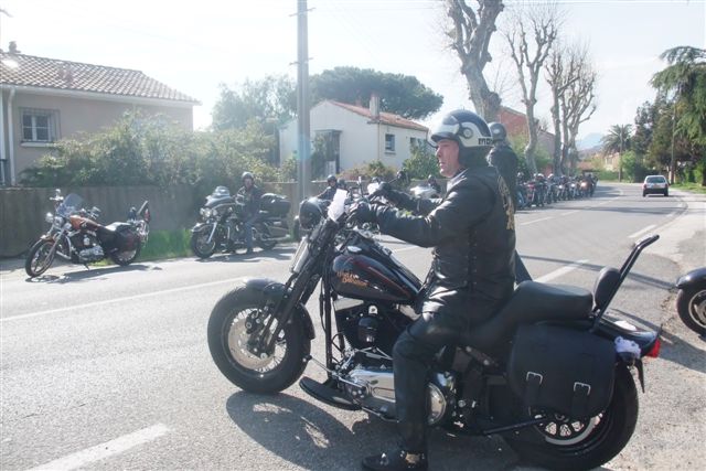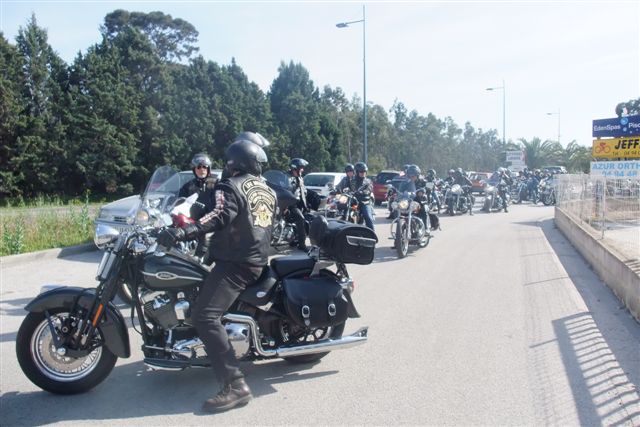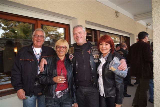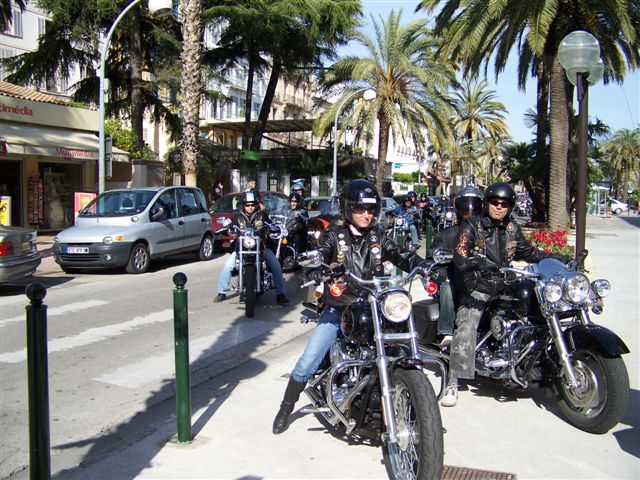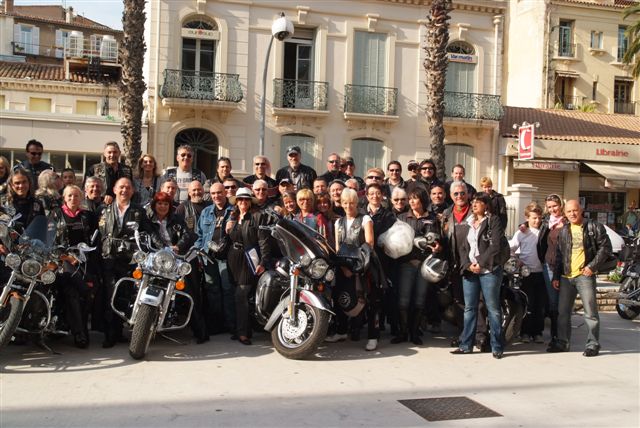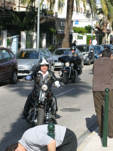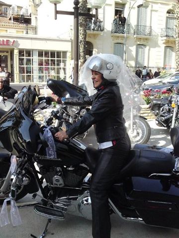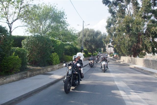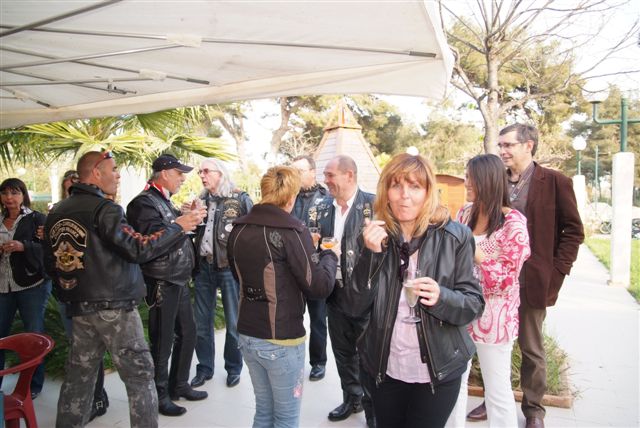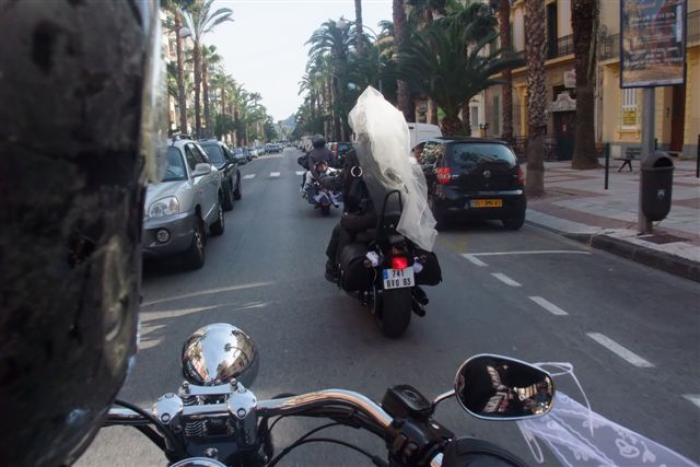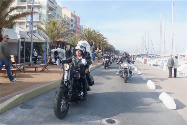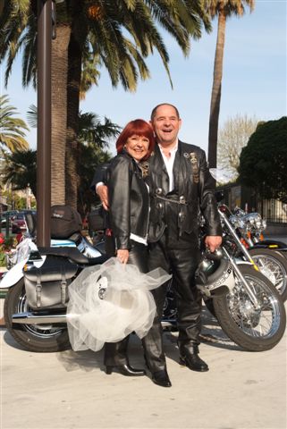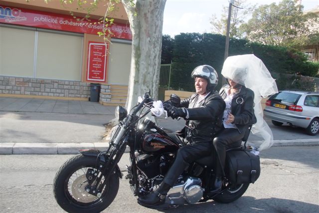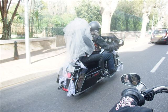 de Harley-Davidson a escorté les jeunes mariés du domicile des promis à la Mairie d'Hyères les Palmiers, puis le joyeux et tonitruant cortège s'est dirigé au travers des rues animées de la cité, vers le Port et les plages, pour arriver aux "Pins Maritimes" où un buffet d'honneur l'attendait.